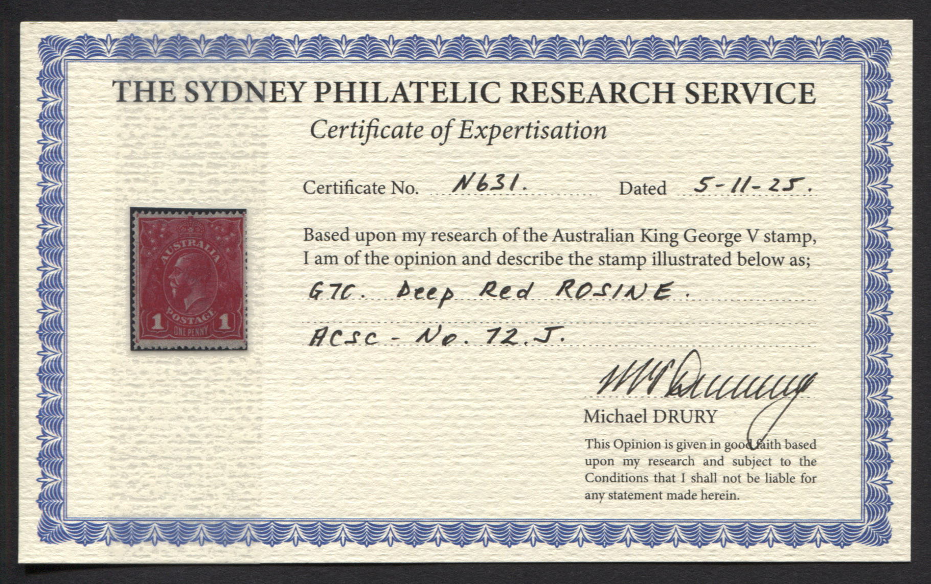 Single wmk, rough paper. 1d DEEP RED ROSINE, die 1. Super fine for this issue, mint lightly hinged. DRURY Certificate.