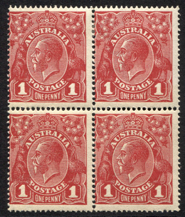 Single wmk 1d rose-carmine, die 3. A block of 4. Lower left stamp has variety: BREAK IN UPPER FRAME AT LEFT. Top row is mint lightly hinged, the bottom row is mint unhinged. Fresh.