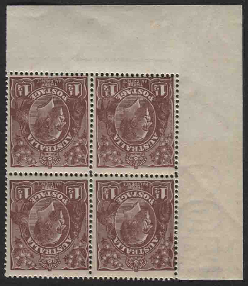 Single wmk, 1½d brown, wmk INVERTED. A superb, lower left corner block of 4. Extra fine, totally mint unhinged. SCARCE.