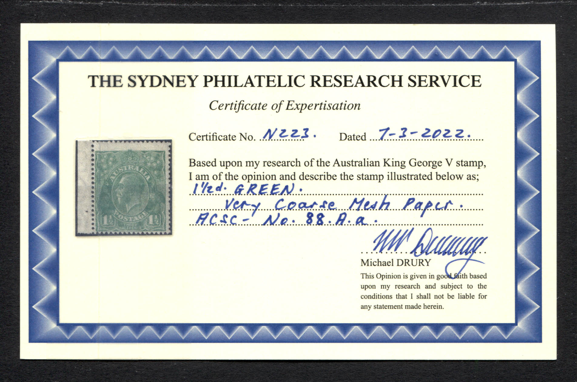 Single Watermark 1½d green VERY COARSE MESH PAPER. DRURY CERTIFICATE. Diagonal gum bend on reverse, otherwise fresh mint unhinged.