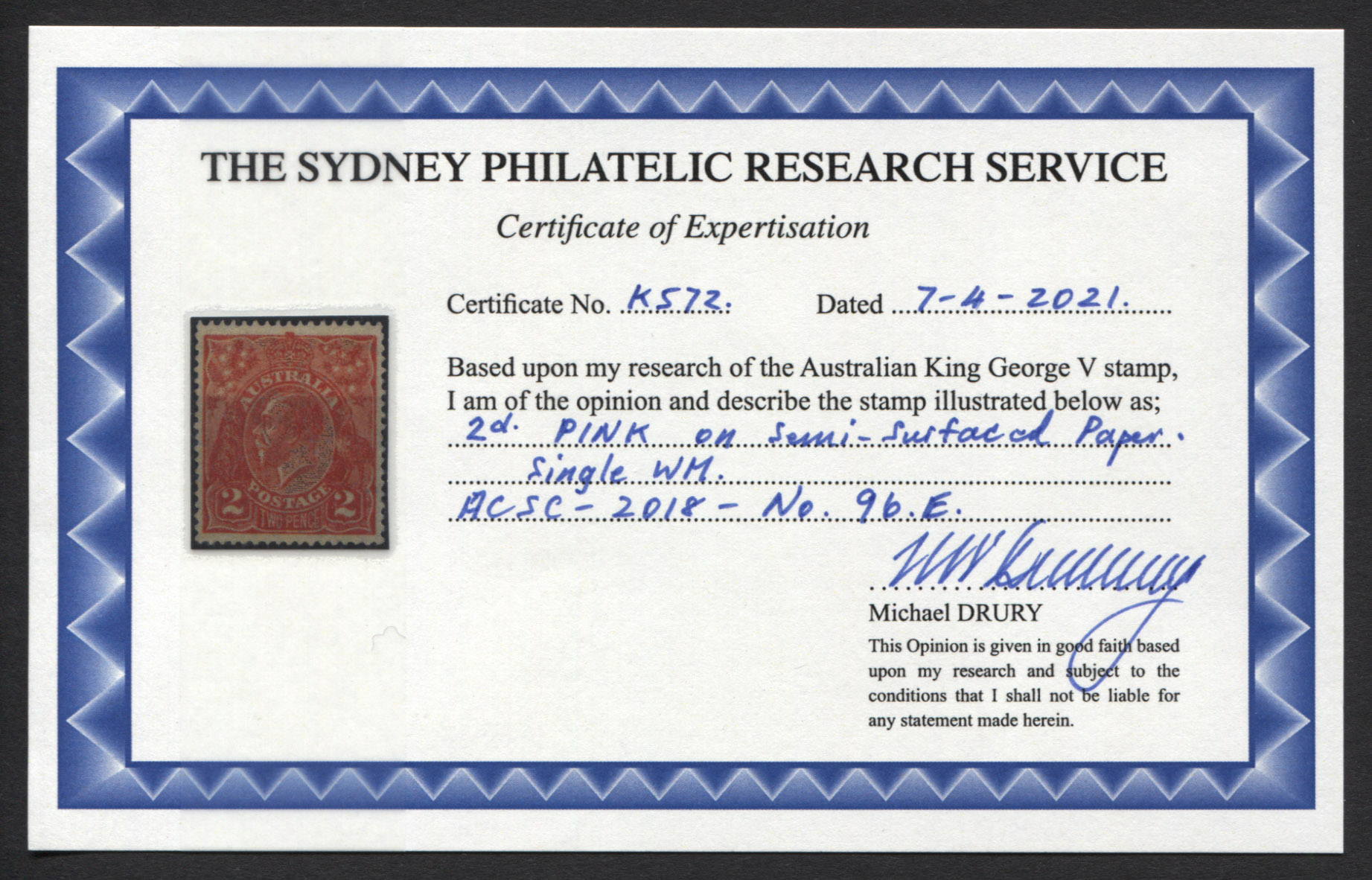 Single wmk, 2d PINK – SEMI SURFACED PAPER. Drury Certificate. Extra fine,