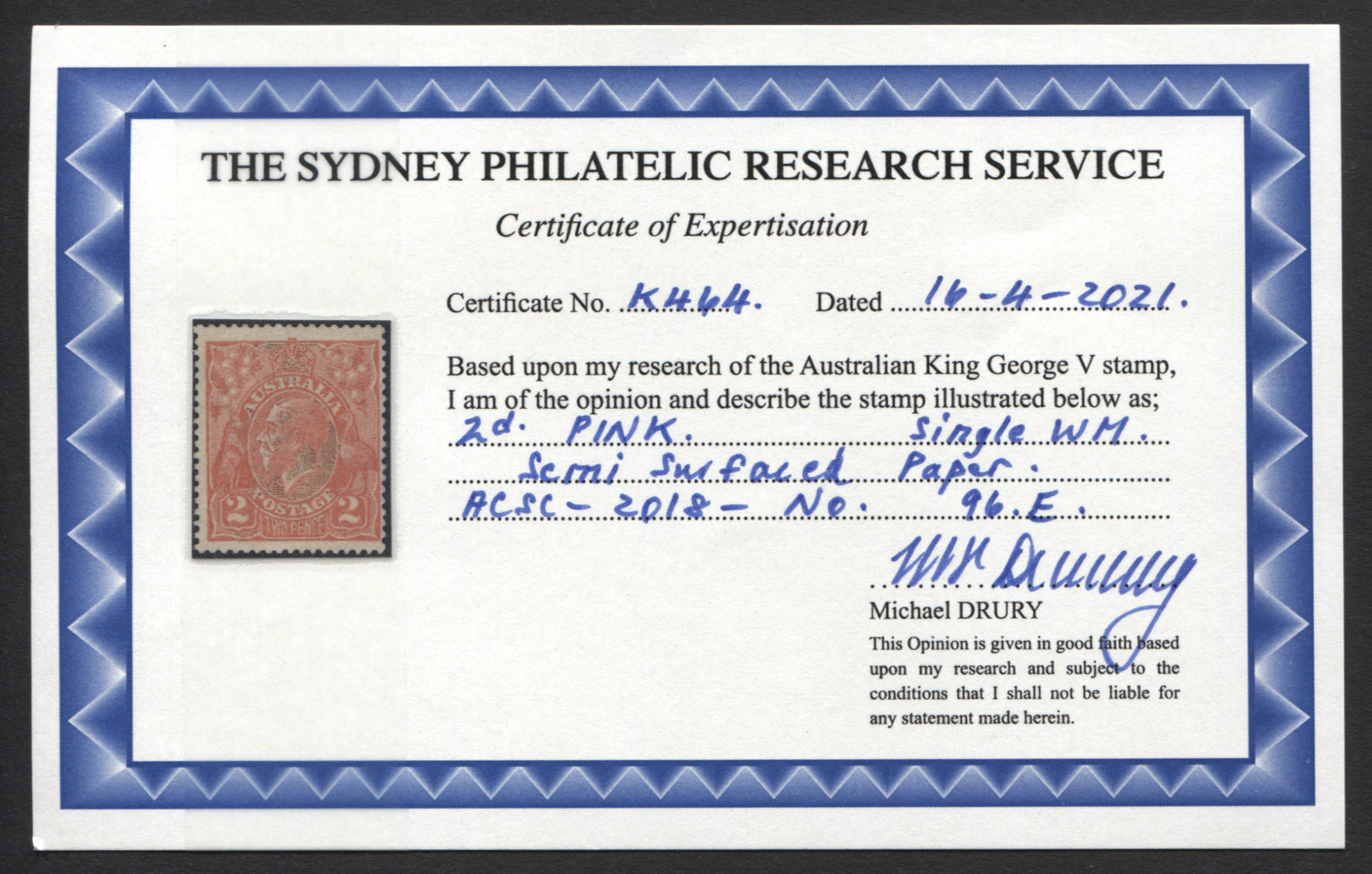 Single wmk, 2d PINK – SEMI SURFACED PAPER. Drury Certificate.