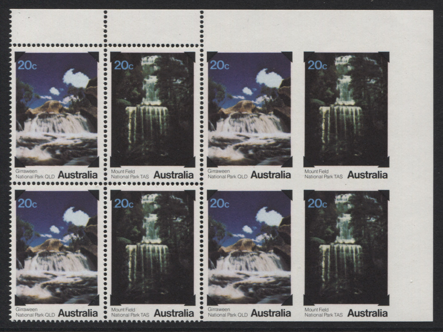 National Parks 20¢ waterfalls se-tenant pair. An upper right corner block of 8, showing two IMPERFORATE SE-TENANT PAIRS AT RIGHT. Extra fine, mint unhinged.