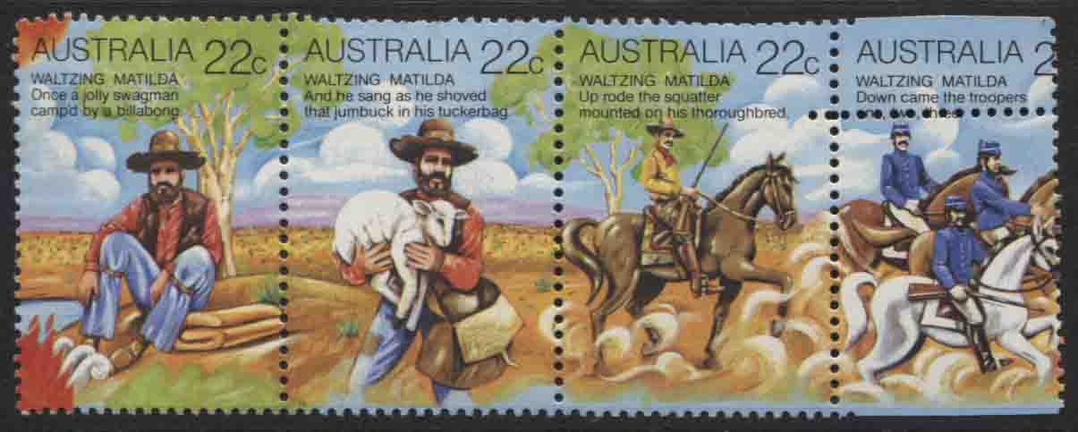 Waltzing Matilda strip of 4, right unit with misplaced perforations.