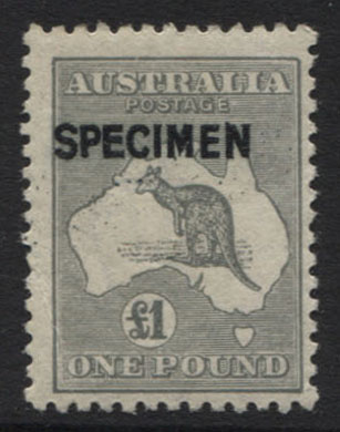 £1 grey SPECIMEN overprint, TYPE B, mint unhinged. Faint crease bottom left corner, not visible from the front. Otherwise superb – scarce variant.