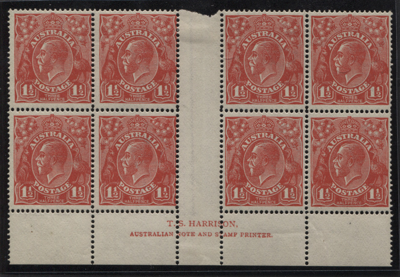 1½d scarlet, HARRISON IMPRINT (upper plate) block of 8. Fine