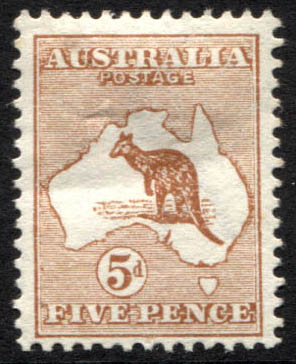 10/- grey-pink. Variety: BROKEN COAST NEAR SYDNEY & WHITE FLAW AFTER "I" OF AUSTRALIA. Fine...$850.00 -