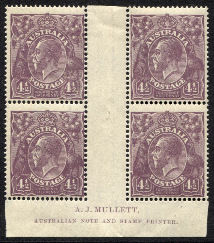 Single wmk 4½d violet. MULLETT imprint block of 4 with additional variety: BREAK IN LEFT FRAME. Upper stamps are mint very lightly hinged, the lower are mint unhinged. Very fine.