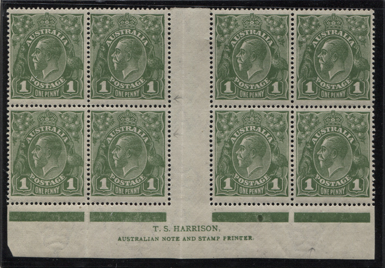 Large multiple wmk, 1d green, PLATE 4, HARRISON IMPRINT block of 8. Fine mint with varieties “ferns” and “RA joined”.