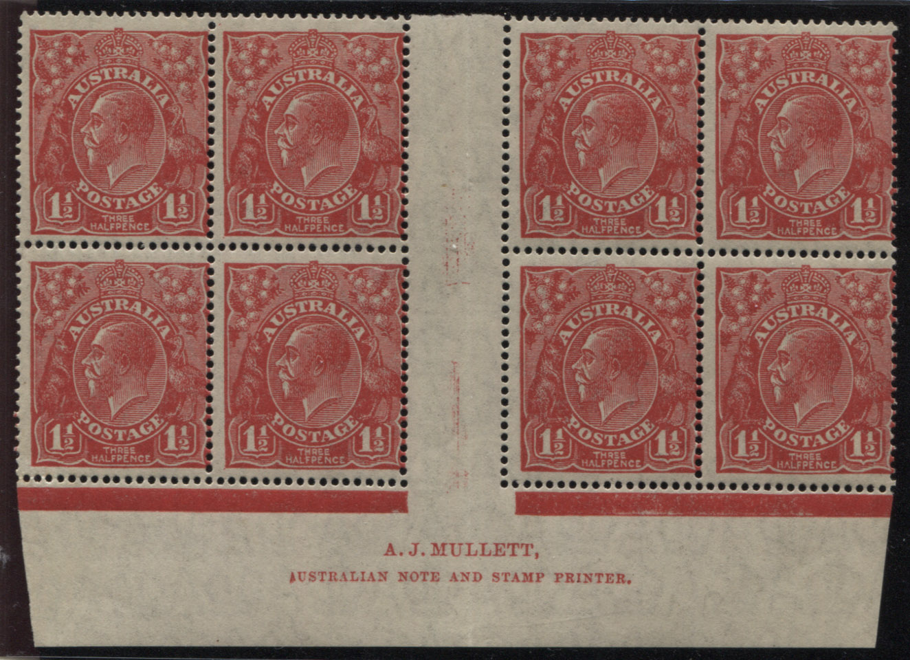 Small multiple wmk, perf 14. 1½d red MULLET IMPRINT block of 8, PLATE 1A. Less than a handful of imprint blocks of 8 in existence. VERY SCARCE. 2 mint lightly hinged/ 6 mint unhinged.