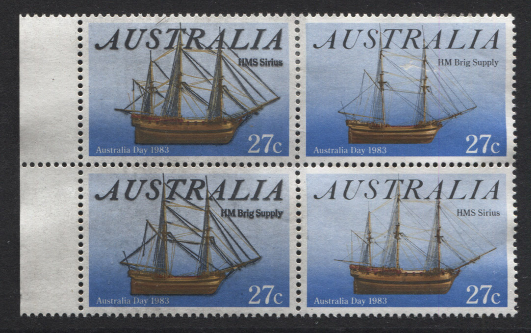 AUSTRALIA DAY. Vertical se-tenant pair at left has BLACK kiss print and smudging, resulting in bold printing appearance. Unlisted in ACSC. Unused (no gum). (Light hinge in in reinforcing).