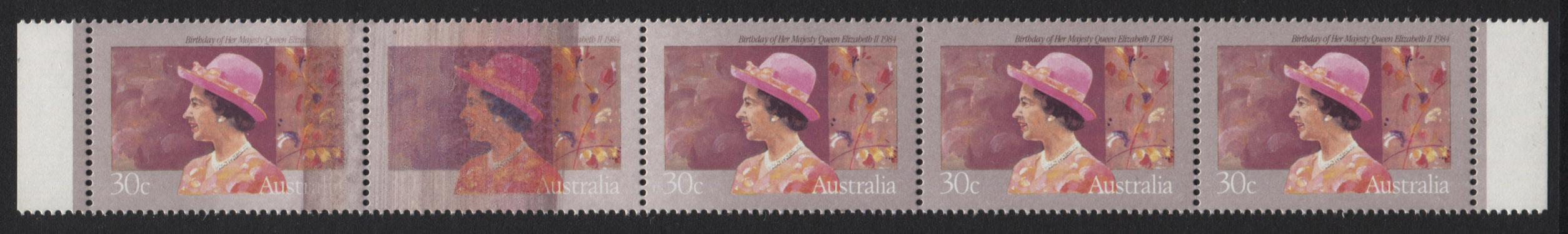 QEII 30¢ Birthday. A strip of 5, showing variable partial omission and smudging of PURPLE-BROWN in columns 1 and 2, thus differing to ACSC description. Mint unhinged.