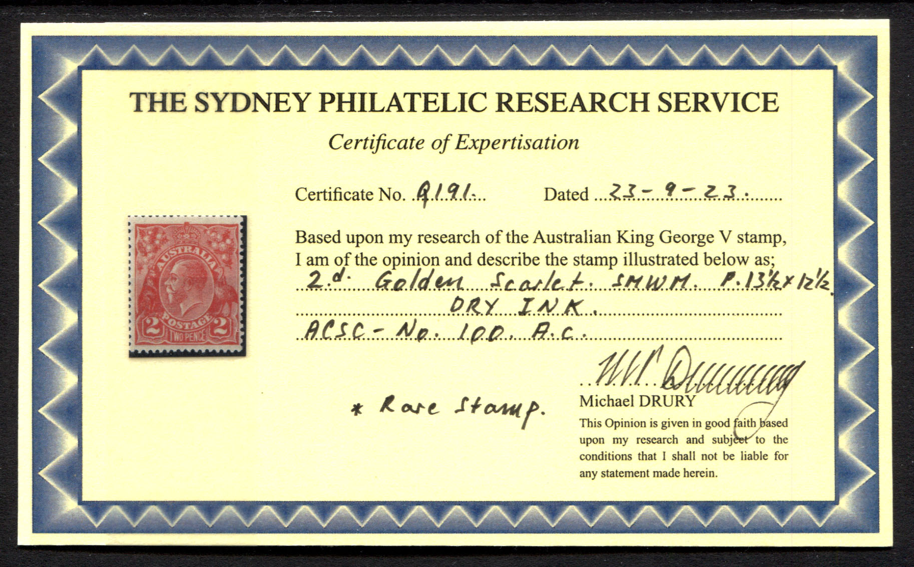 Small multiple wmk, P13½x12½. 2d golden-scarlet, die 2, DRY INK variety. DRURY CERTIFICATE. Mint unhinged.