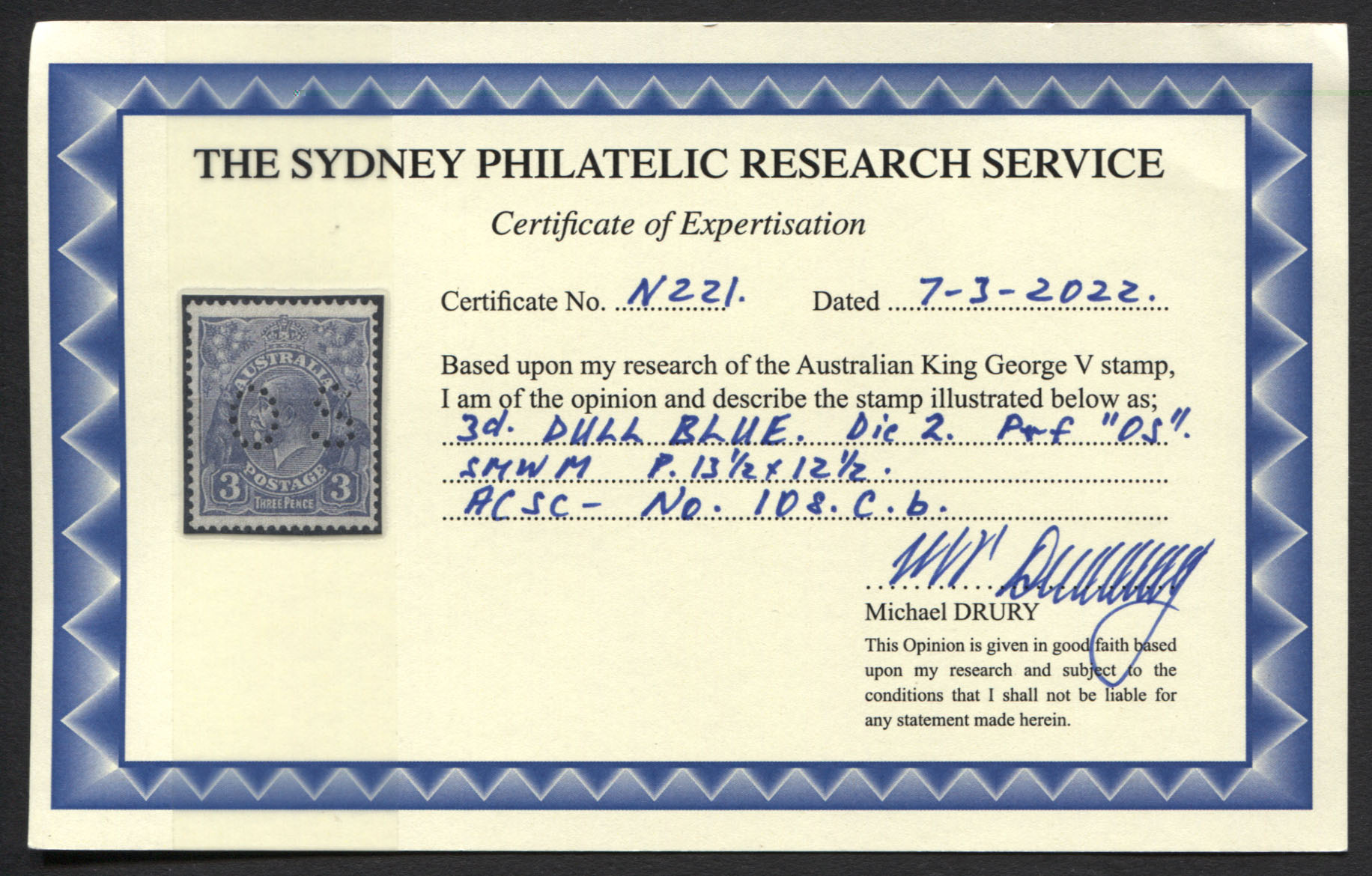 Small multiple wmk, p13½ x 12½. 3d dull blue, die 2, OS. DRURY Certificate. Superb, mint unhinged.