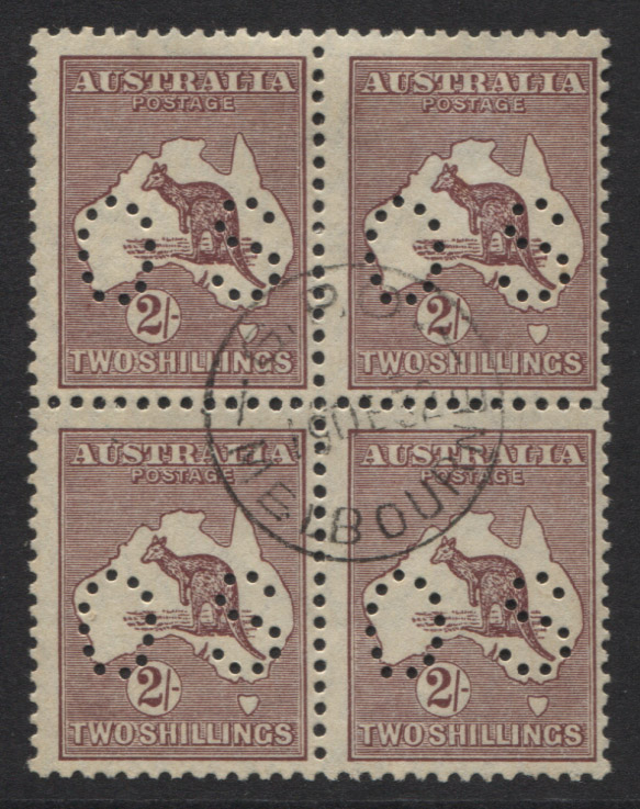 Small multiple wmk, 2/- maroon, OS. A CTO block of 4: MELBOURNE GPO, 19 DE ’32 CDS. Very fine (no gum).