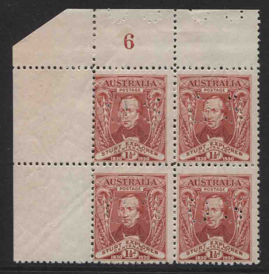 STURT 1½d carmine, OS. Plate No 6, upper left corner block of 4. All stamps are very fresh, mint unhinged (light hinging in upper selvedge only). SCARCE.