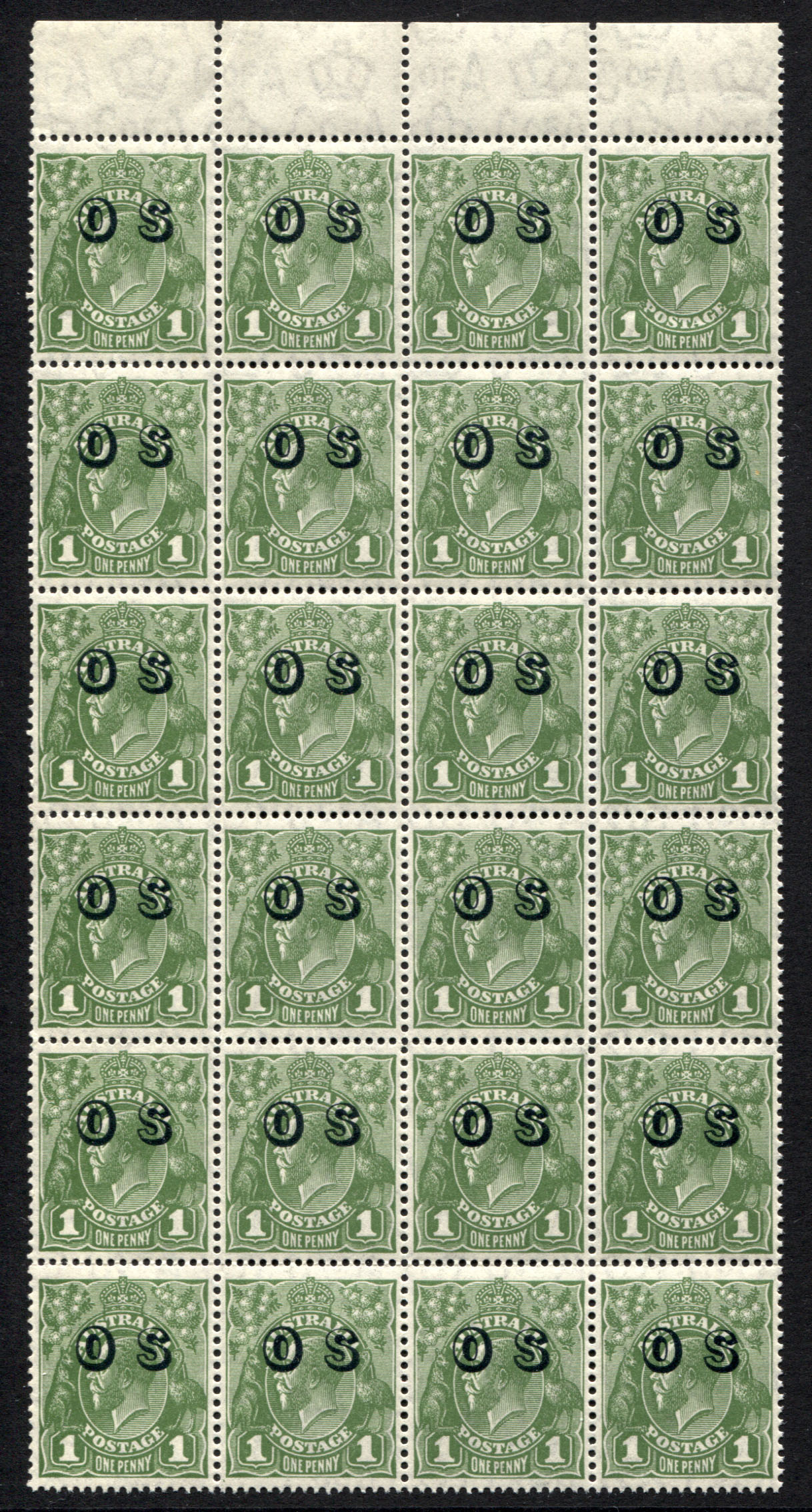 KGV CofA wmk 1d green OS overprint. A positional block of 24 illustrating a total of 6 PLATE VARIETIES. All very fine and mint unhinged (ACSC value for varieties mint lightly hinged – $500 plus).