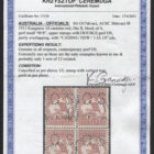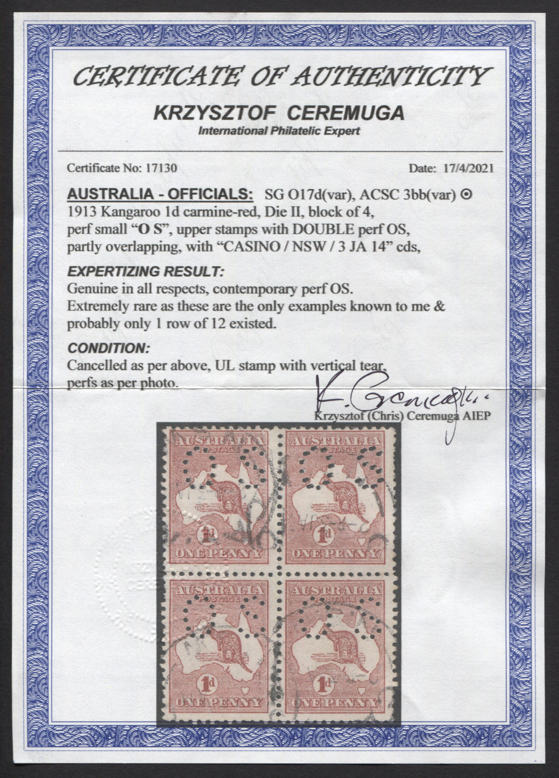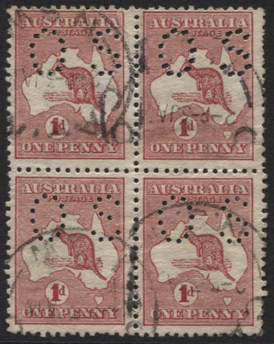 1d red, die 2, small OS. A block of 4 showing upper row with DOUBLE ‘OS’. Condition description as per Ceremuga Certificate. Used.