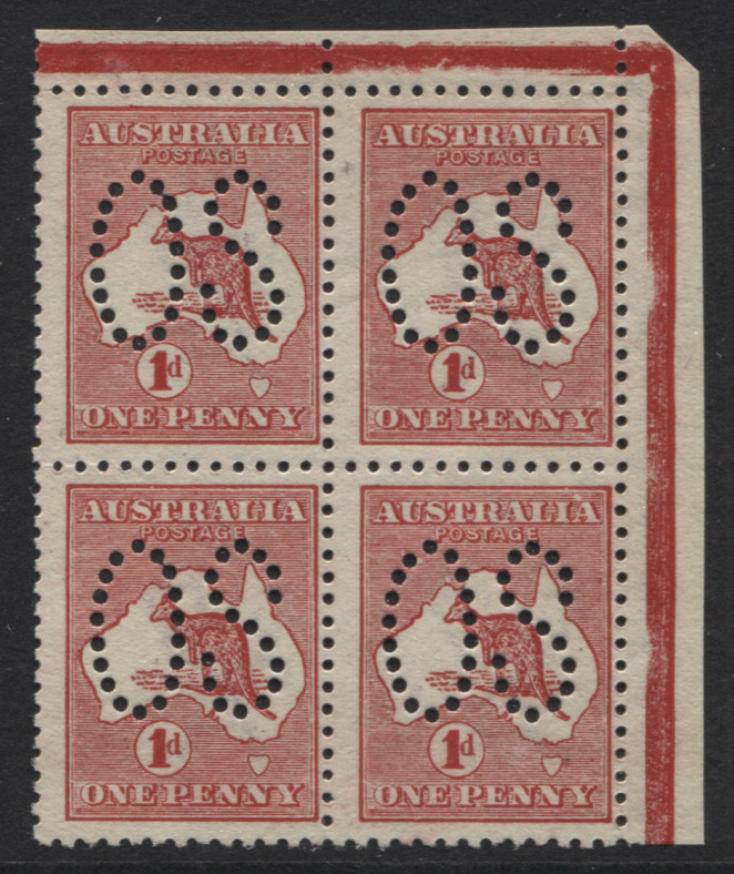 1d red, die 1, large OS. Upper right corner block of 4. Lower right stamp has variety: WHITE FLAW OVER ‘IA’. Mint unhinged.