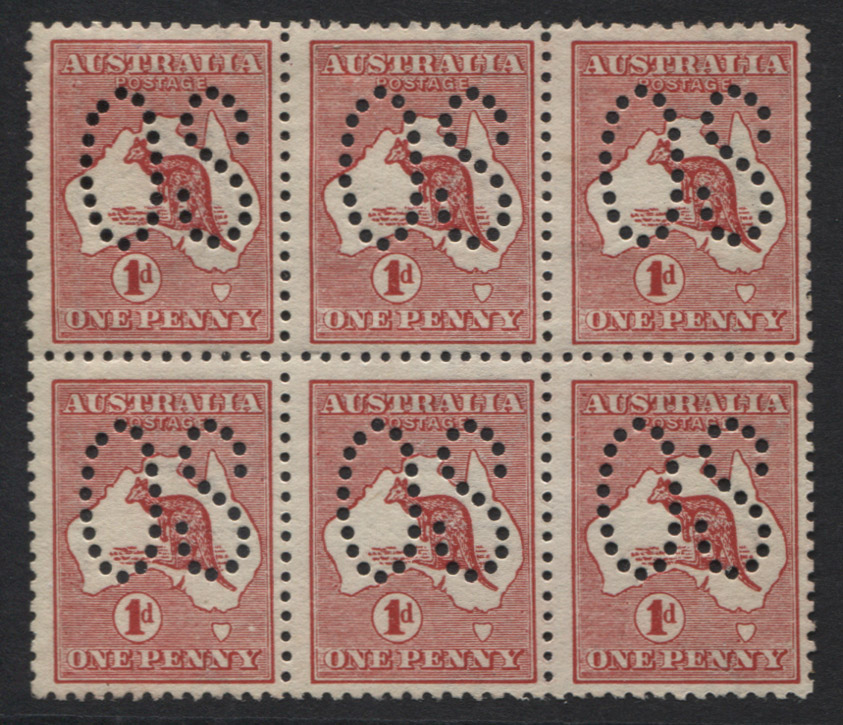 2d red, die 1, large OS. Lower left stamp with variety: WHITE FLAW ABOVE ‘Y’ of ‘PENNY’. Upper right stamp with break in inner frame at top right. Variety stamps are mint unhinged.
