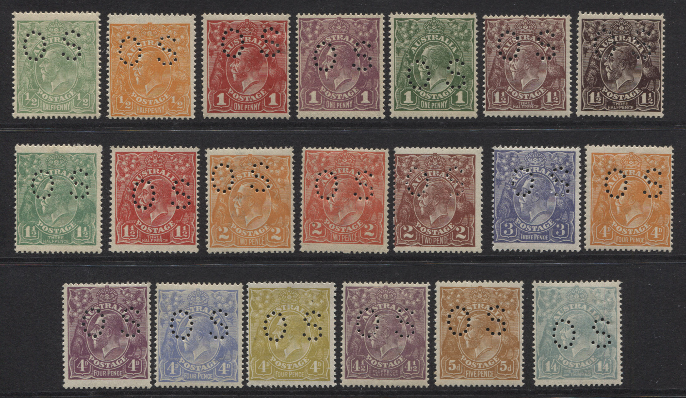 Single wmk, OS perfin. A simplified set of 20 stamps. Mostly mint lightly hinged, several are mint unhinged. A scarce assembly.