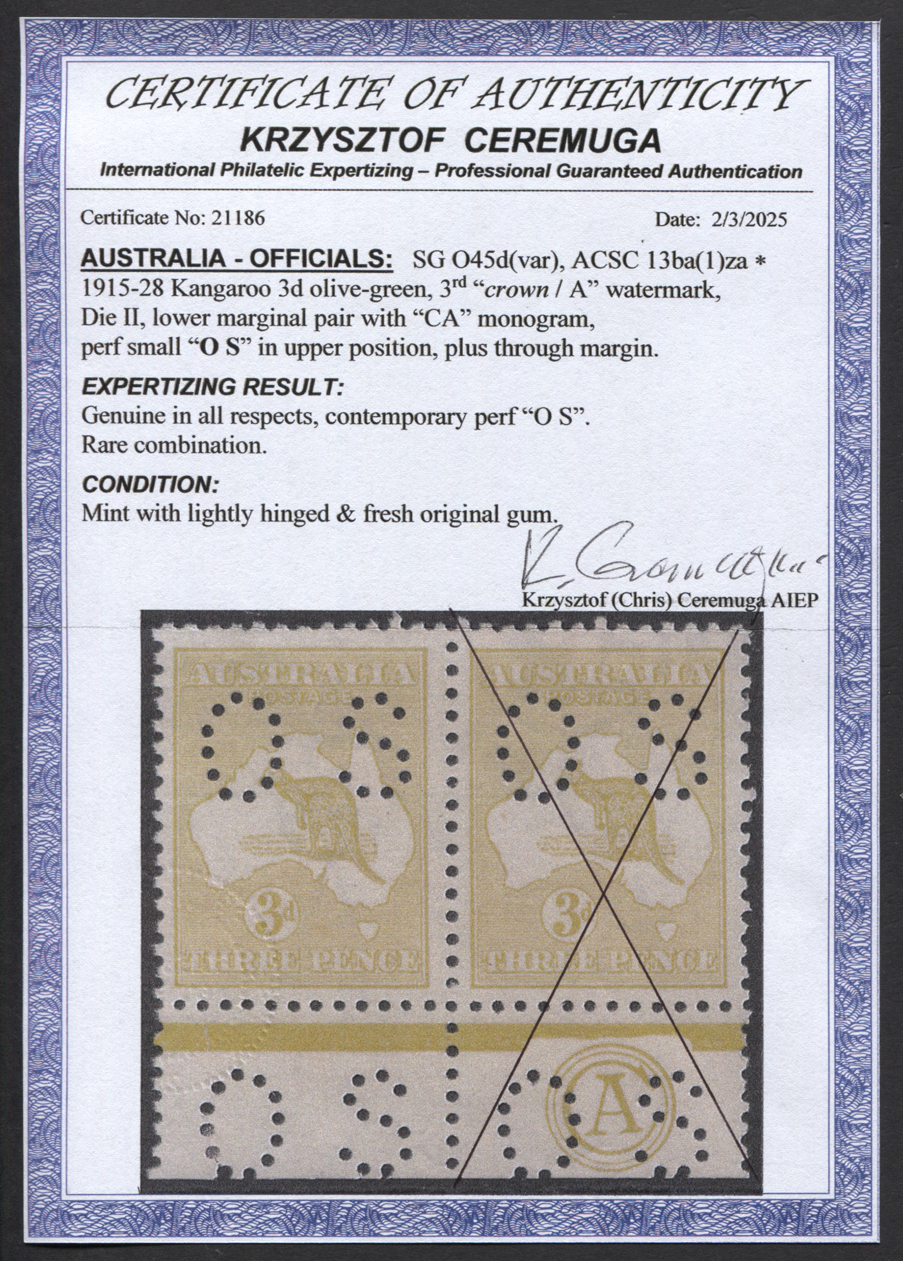 3d olive-green, DIE 2, OS. A RARE combination. Ceremuga Certificate (photocopy). Very fine, mint lightly hinged.