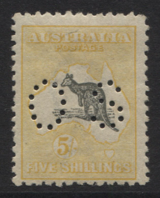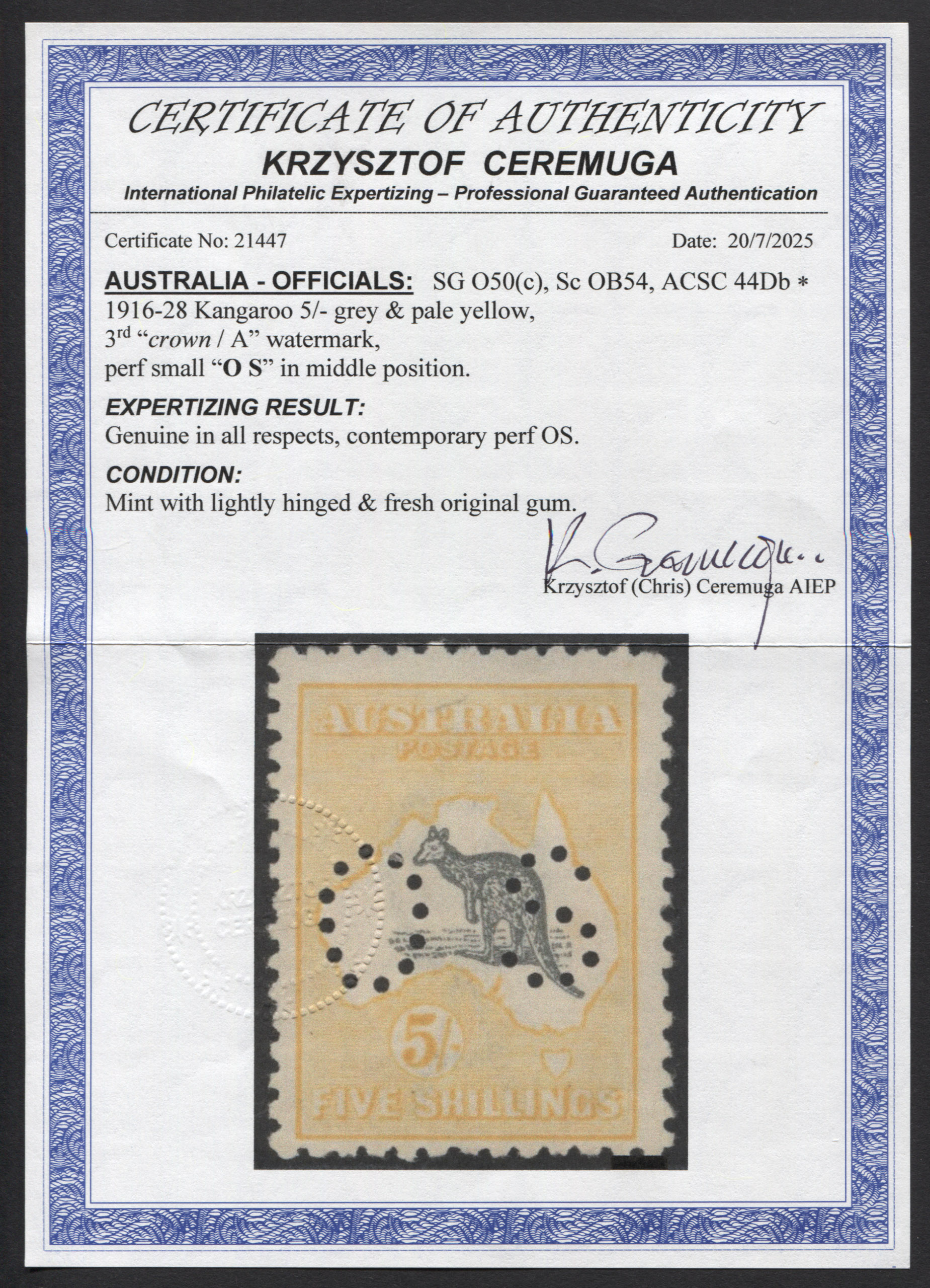 5/- grey and yellow, OS. Ceremuga Certificate. Fresh,