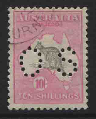 5/- grey/pale yellow perforated OS, "misplaced Kangaroo into bight", fine commercially used example.$1,750.00 -
