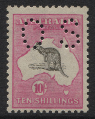 10/- grey and bright aniline pink, OS perfin. Extra fine and fresh. PCNZA Certificate. Mint unhinged.