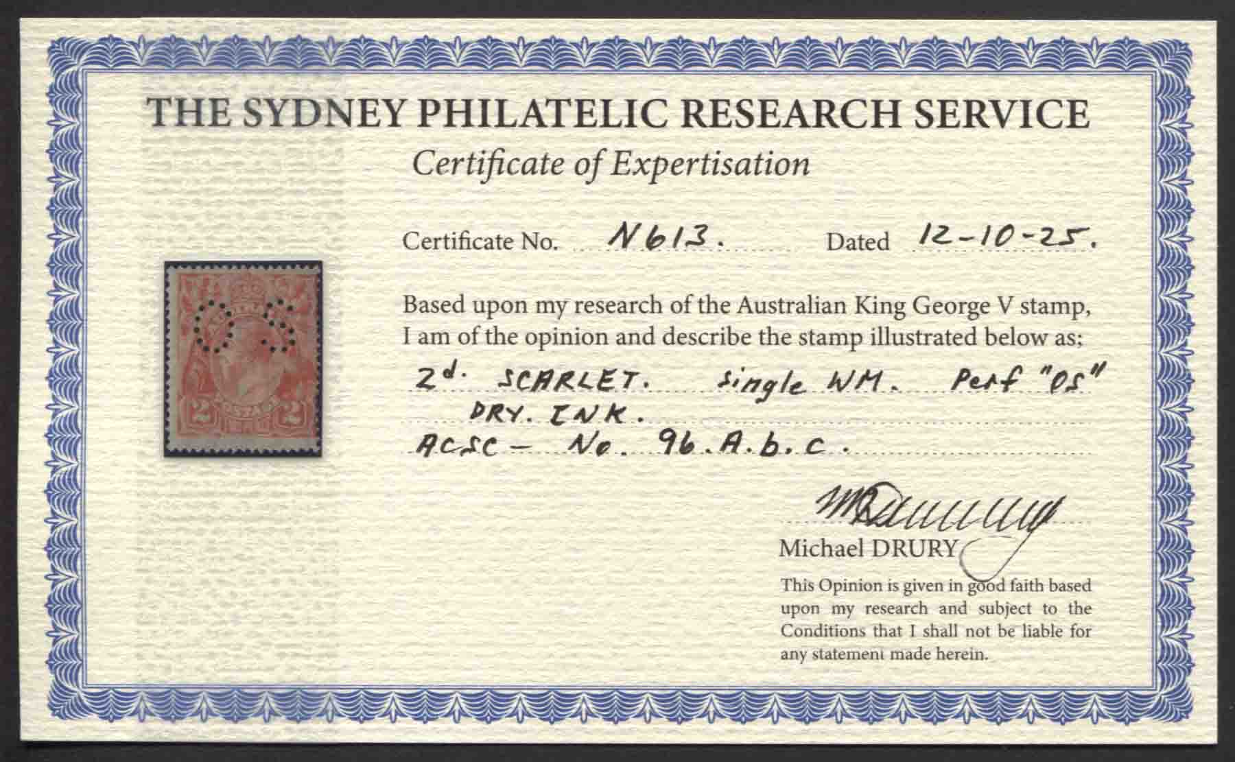 Single wmk, 2d scarlet OS, DRY INK variety. DRURY Certificate.