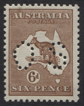 6d chestnut, OS perfin. A super fresh block of 4, left column stamps show BULGING...$600.00 -
