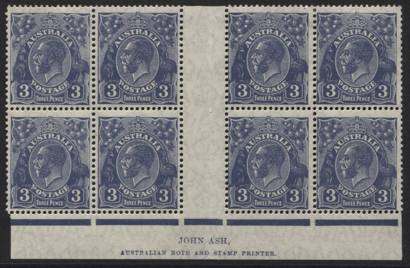 Small multiple wmk, p13½ x 12½, 3d blue, die 2, ASH imprint. Block of 8 – 4 mint unhinged/4 mint lightly hinged. Fresh.