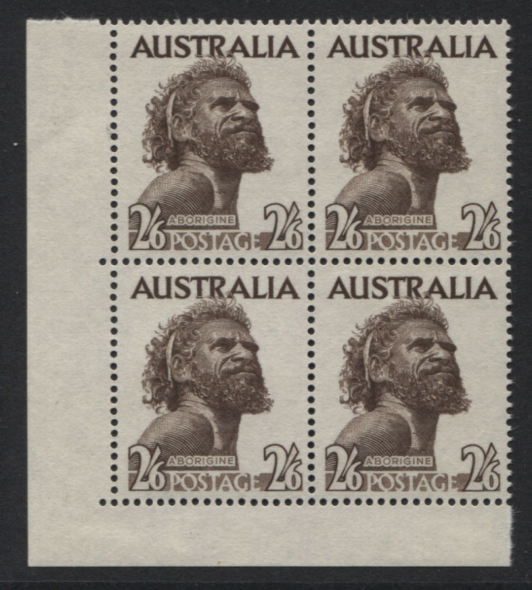 2/6 Aborigine, NO IMPRINT corner block of 4. Totally