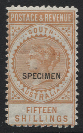 POSTAGE & REVENUE 15/- orange, perf 10 SPECIMEN (12mm) overprint. Extra fine,
