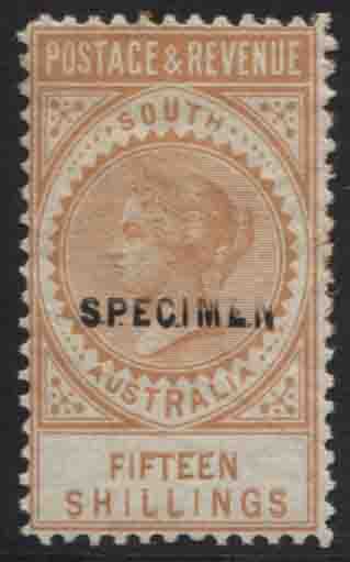 POSTAGE & REVENUE. 15/- brownish-yellow, perf 10. SPECIMEN OVERPRINT (3rd type), 15mm x 2mm. Mint hinged.