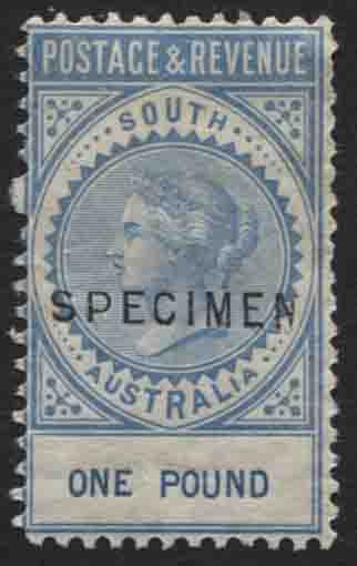 POSTAGE & REVENUE. £1 blue, perf 10. SPECIMEN OVERPRINT (1st type), 18.5mm x 2.5mm. RARE. Mint hinged.