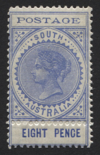 Long type 8d ultramarine, thin POSTAGE with BLIND PERFS above EIGHT PENCE. Acquired from Ray Chapman ‘Colonies Collection’. Extra fine, mint lightly hinged.