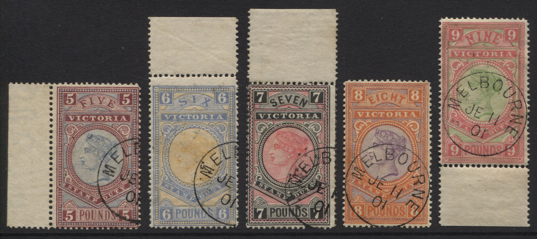 STAMP DUTY £5 – £9. A CTO set of 5 (3 with selvedge). Very fine.