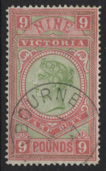 QV £9 apple-green and rosine, perf 12½. Cancelled to order, extra fine.