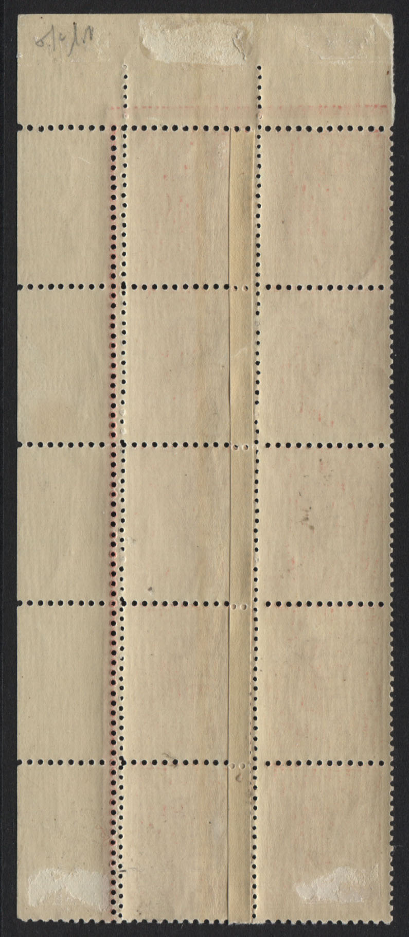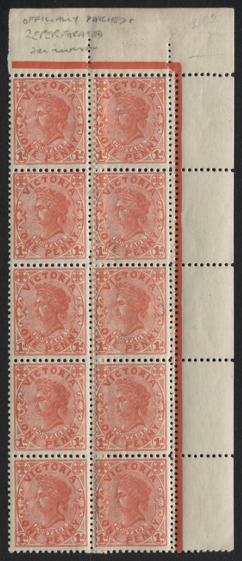 QV 1d rose-red. A corner block of 10, officially patched and re-perforated vertically by printer. Very fine, mint lightly hinged.