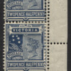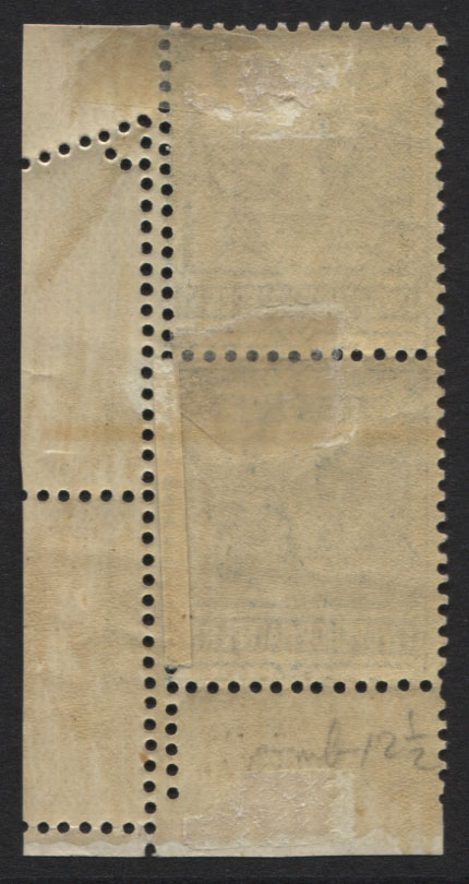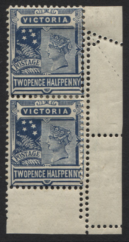 QV 2½d deep dull blue, perf 12½. A vertical corner pair showing double vertical perforations and official patching on reverse. Fine, mint hinged.